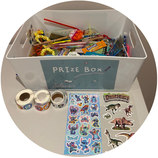 At the end of every lesson each child is allowed to choose at least one sticker and one prize.
